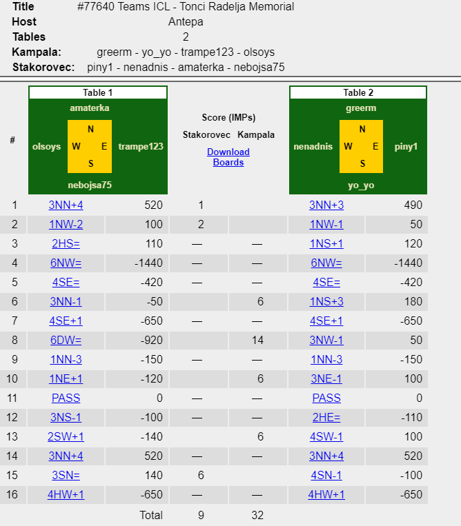 The match against the team of Štakorovec started a bit clumsy for our team, a couple of part-scores were won by our opponents. Soon afterwards, however, they started overbidding game, then missed a slam in diamonds and then unsuccessfully tried to make up by overbidding again. On the contrary, our team bid and made the slam in diamonds and also avoided the overbidding trap. Well done to all! You may download the .lin file with the hands played tonight here: https://bit.ly/3EnGYfj