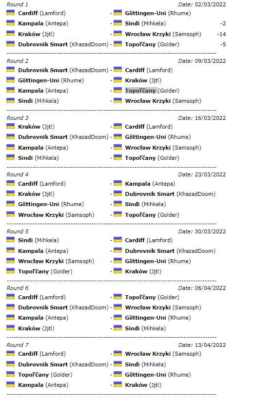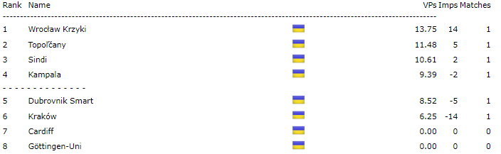 The initial ranking, based on the first round played (Cardiff and Göttingen-Uni have not played yet), is displayed below: