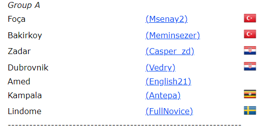 The first match will start at 20:00 CEST (Rome and Oslo time), that is an hour earlier than the usual starting time; therefore, please make sure that you’re ready to play by that time. I have agreed with Vedat that barometer will be on, as we usually like it and that it will be one team match straight, with no set break at half-time. Of course, any time you need to take a small break, you may ask the TD, mentioning BRB (be right back) in X minutes.