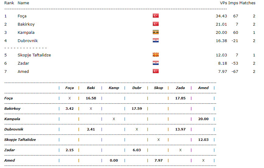 Here are the results, so far, in our group. Please bear in mind that we have played only one match (last column of the results table).
