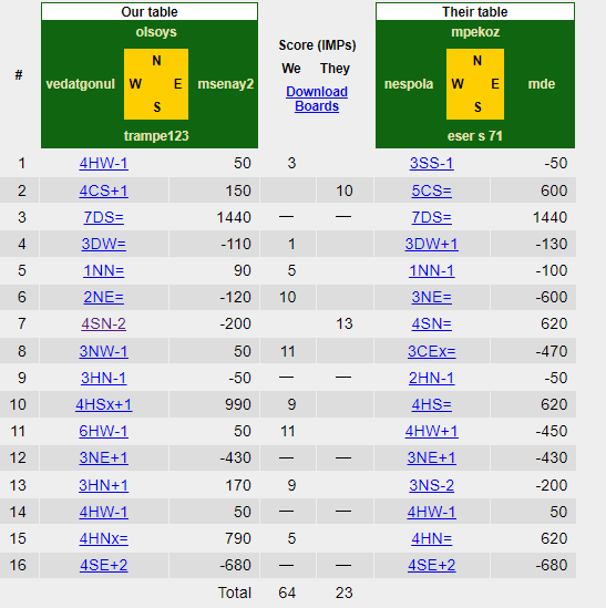 Last Wednesday’s result of our match against the team of Foça was a clear victory for us. Indeed, only two boards out of 16 were won by our opponents. The two pairs of our opponents seemed not to be communicating properly, or were, in fact, dumbfounded by the excellent bidding and play of our two pairs and were unable to follow through.