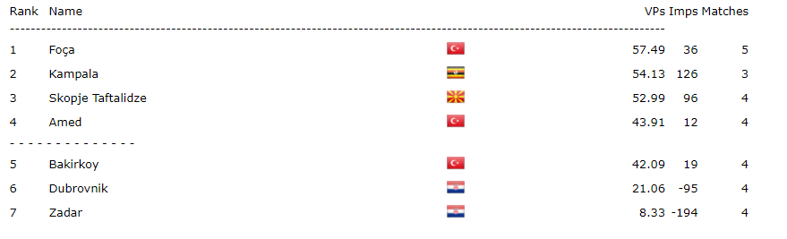 As a team, we had a bye (one match less) and one match that was never played (Bakirkoy). Here’s our ranking: