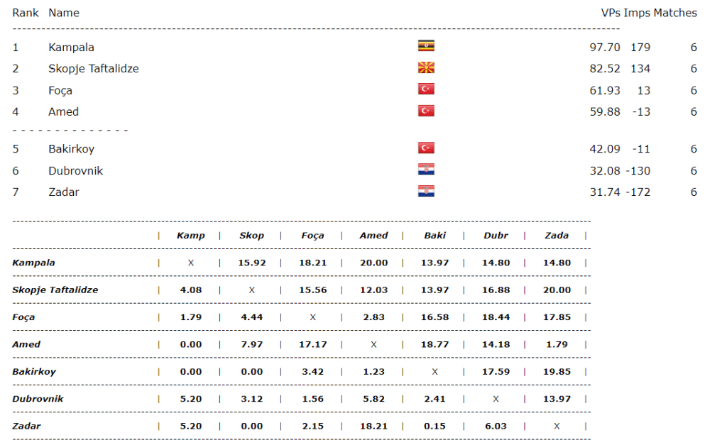 First of all, let’s check our ranking. Please, bear in mind that the non-show of the team of Bakirkoy to their scheduled match and their decision not to communicate with us, or with the ICL management, has resulted in a win for our team by a margin of 13.97 IMPs.