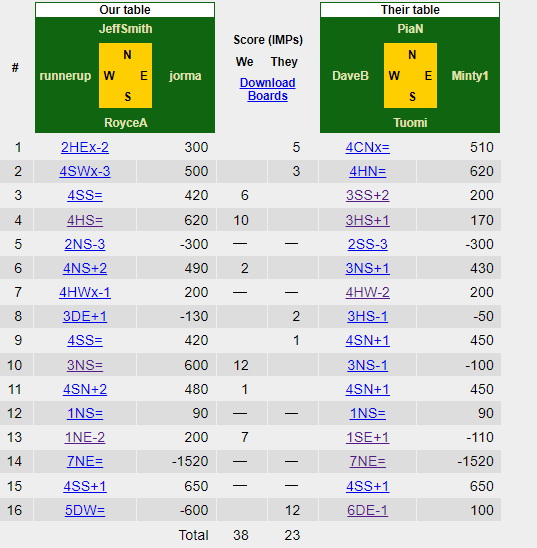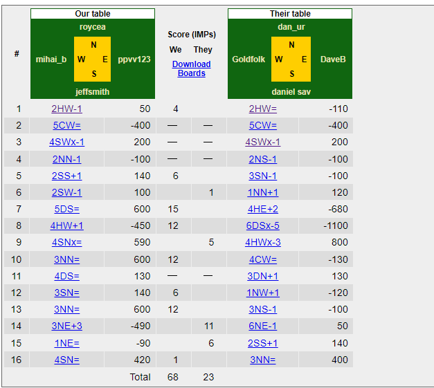 On their match against Helsinki they deployed again roycea – jeffsmith and Minty1 – DaveB. The second pair seems to be playing 2/1, as well. They beat Helsinki by 15 IMPs, again capitalizing on playing mistakes and by making the proper bids without much fuss and choosing the declarer’s seat correctly. Check these results here.